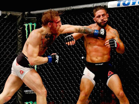 2015年7月、ジョゼ・アルドのフェザー級王座に挑戦が決まっていましたが、アルドは肋骨を負傷して試合をキャンセルしました。アルドは7度も防衛し絶対王者と呼ばれていた超強豪で、試合が流れたことに多くのファンが残念がりました。試合はフェザー級1位のチャド・メンデスと暫定王座となり、マクレガーはキャンセルしたアルドを徹底的に挑発します。しかし試合はメンデスがテイクダウンを奪い、パウンドで一方的にマクレガーを攻める展開になりました。しかしこのパウンドの猛攻を耐え凌ぐと、マクレガーは左ストレートでダウンを奪い、パウンドで試合をストップさせました。劇的な逆転勝利にパフォーマンス・オブ・ザ・ナイトが送られ、観客は熱狂しました。